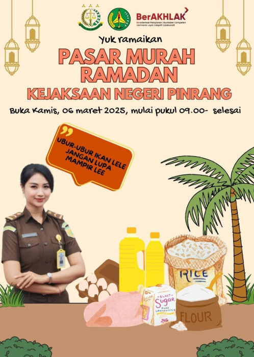 Dalam rangka menyambut bulan suci Ramadan, Kejaksaan Negeri Pinrang akan melaksanakan kegiatan Pasar Murah Ramadan 1446 H yang akan digelar pada Kamis, 6 Maret 2025. Pasar murah ini akan dimulai pada pukul 09.00 WIB hingga selesai, bertempat di halaman Kantor Kejaksaan Negeri Pinrang.